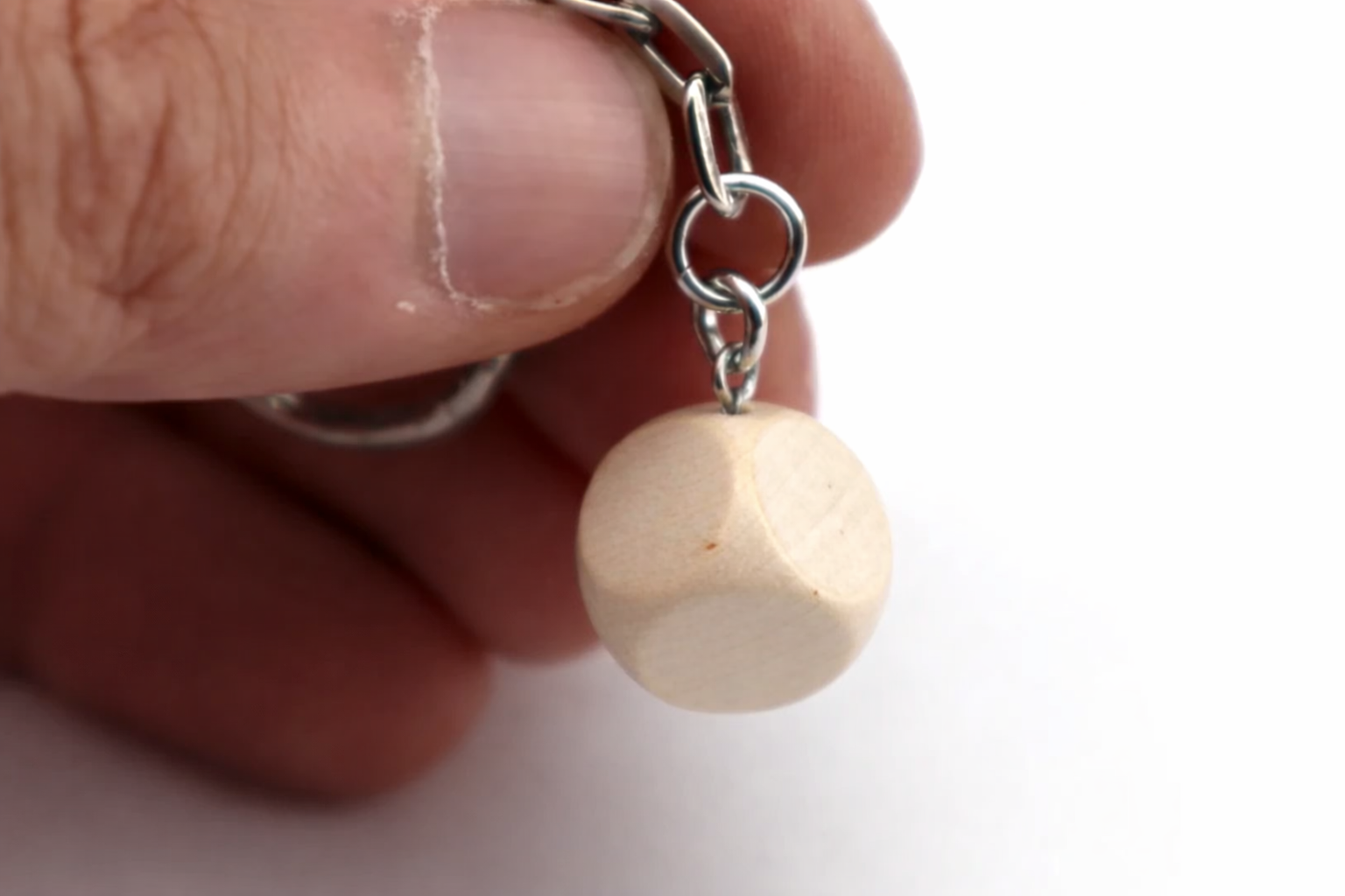 Porte clé en bois d’Hêtre de 1,6cm de côté accroché avec une petite chaine.